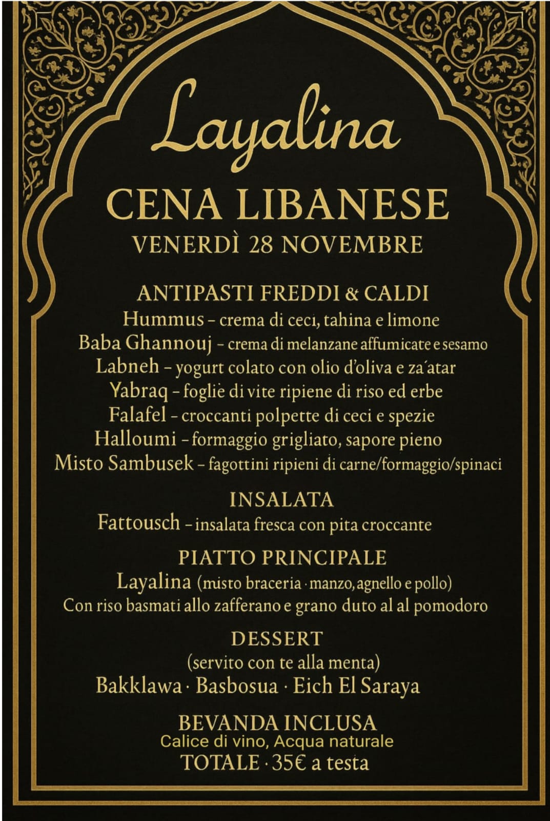 Venerdì 28 Novembre alle 20:45 lasciati trasportare in un viaggio sensoriale tra le atmosfere calde e speziate del Libano. Una serata unica, dove profumi, sapori e tradizioni si fondono in un’esperienza gastronomica autentica e raffinata.